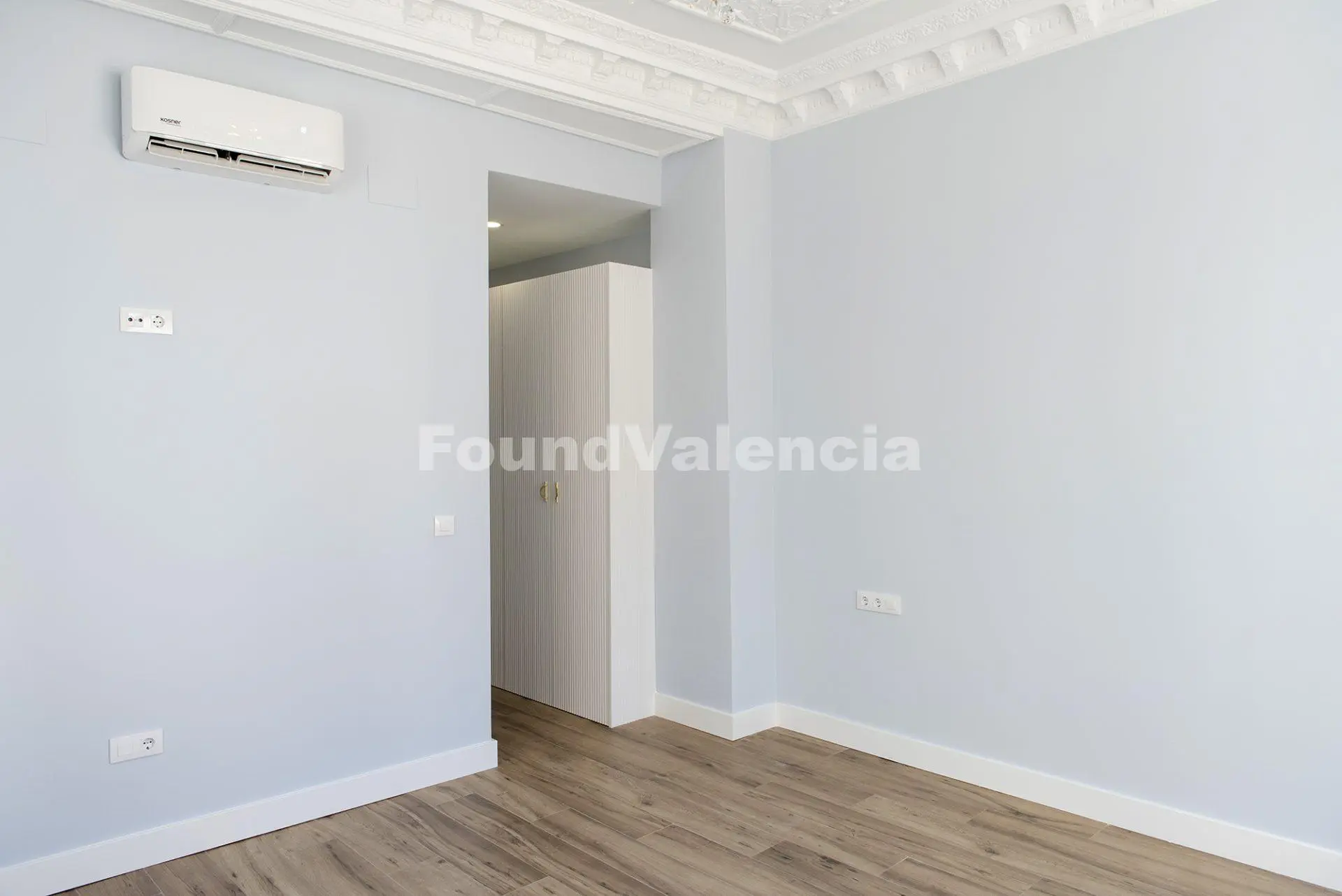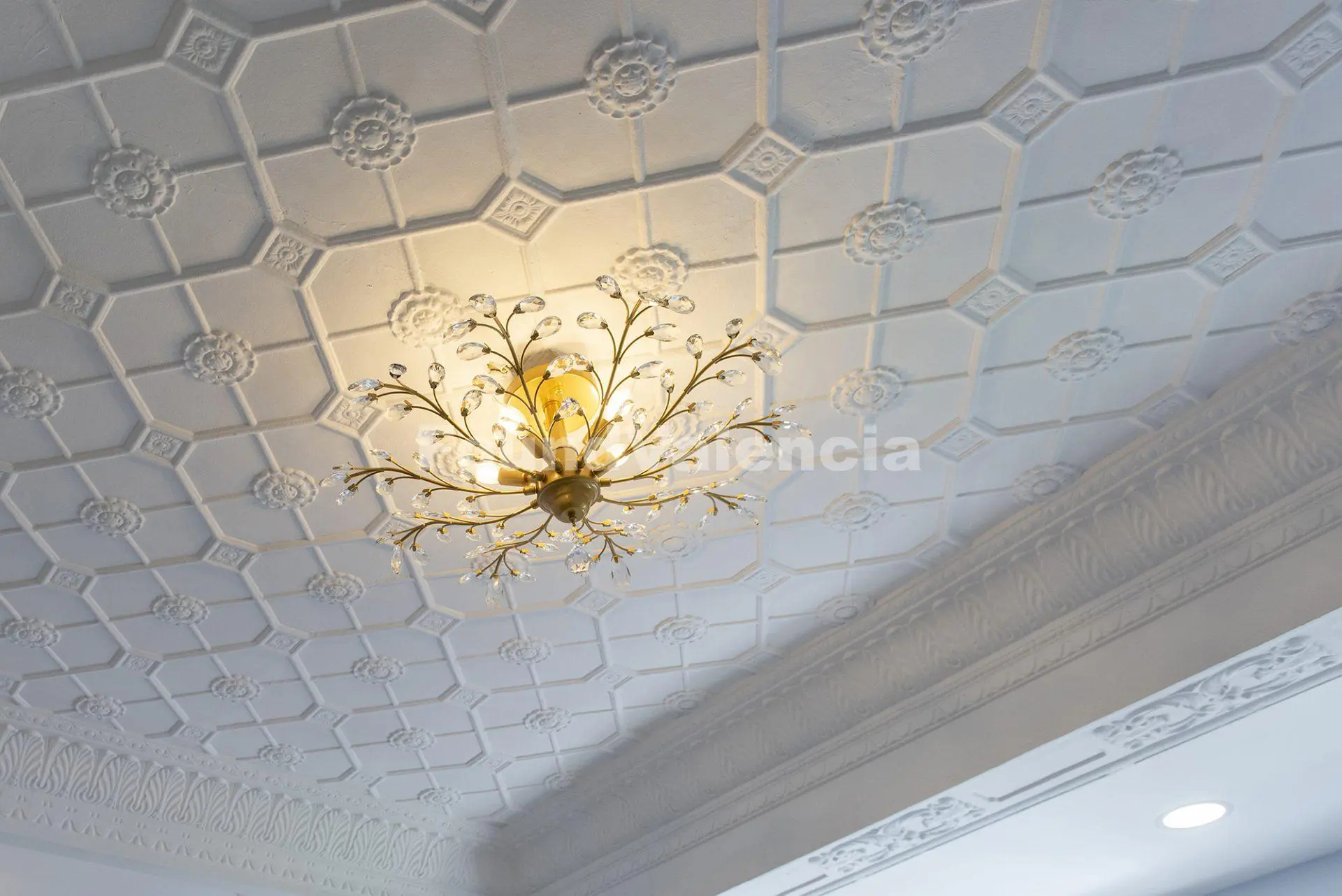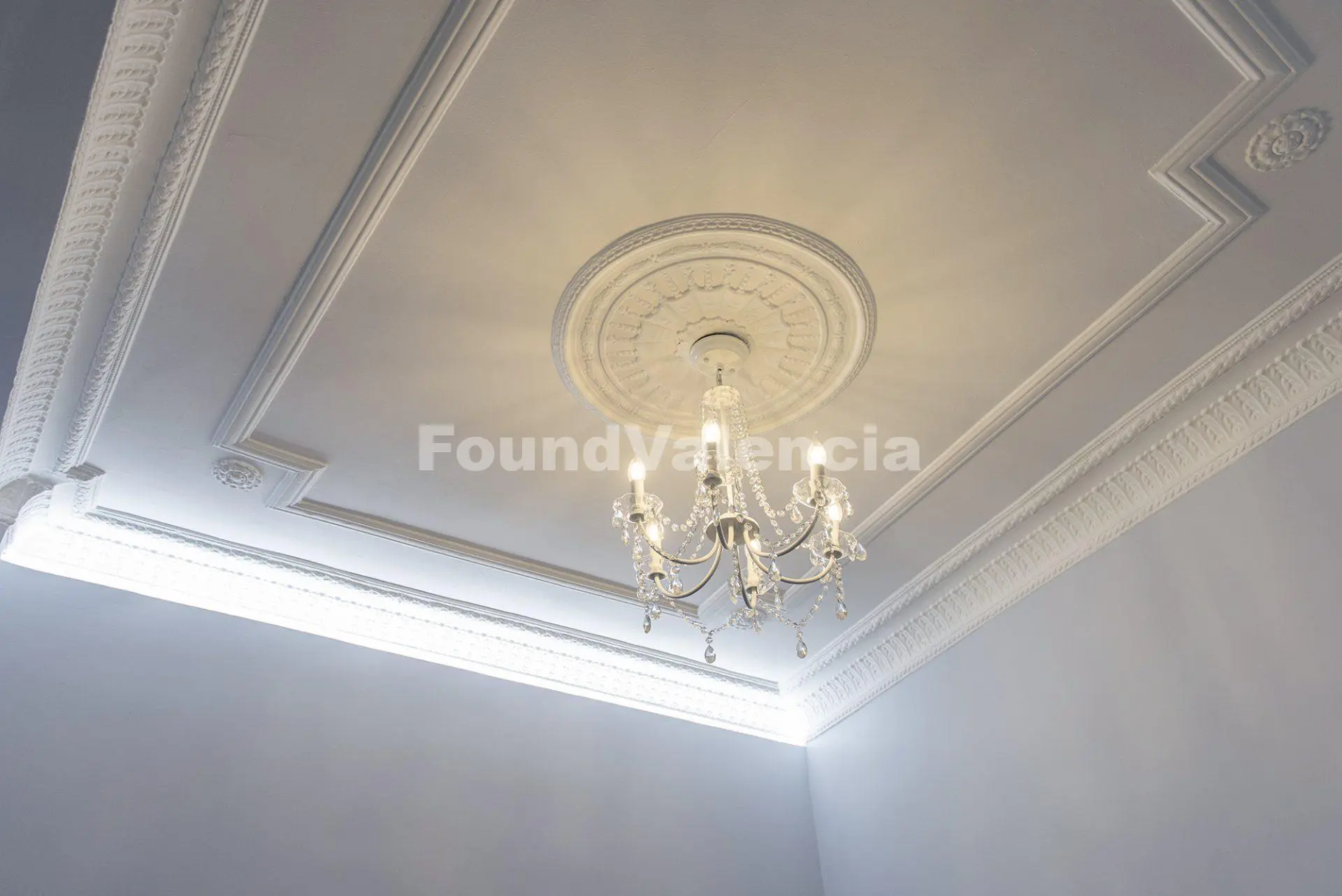Hauts plafonds avec moulures originales restaurées, mettant en valeur l’élégance historique de l’immeuble.